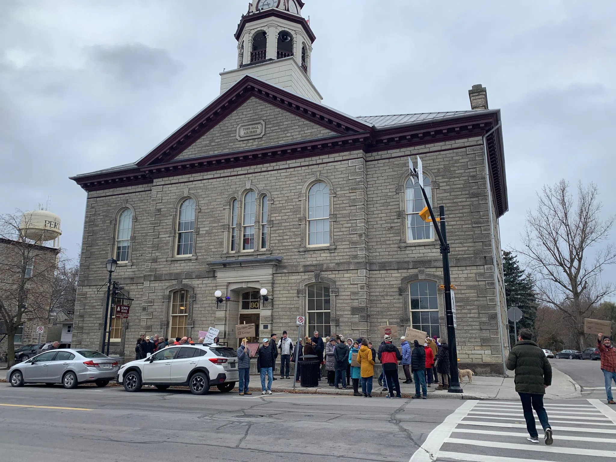 A sizeable crowd of protesters were in front of Perth town hall Tuesday morning making their opinions known about the proposed housing development by Caivan Perth GC Ltd. of the Perth golf course.